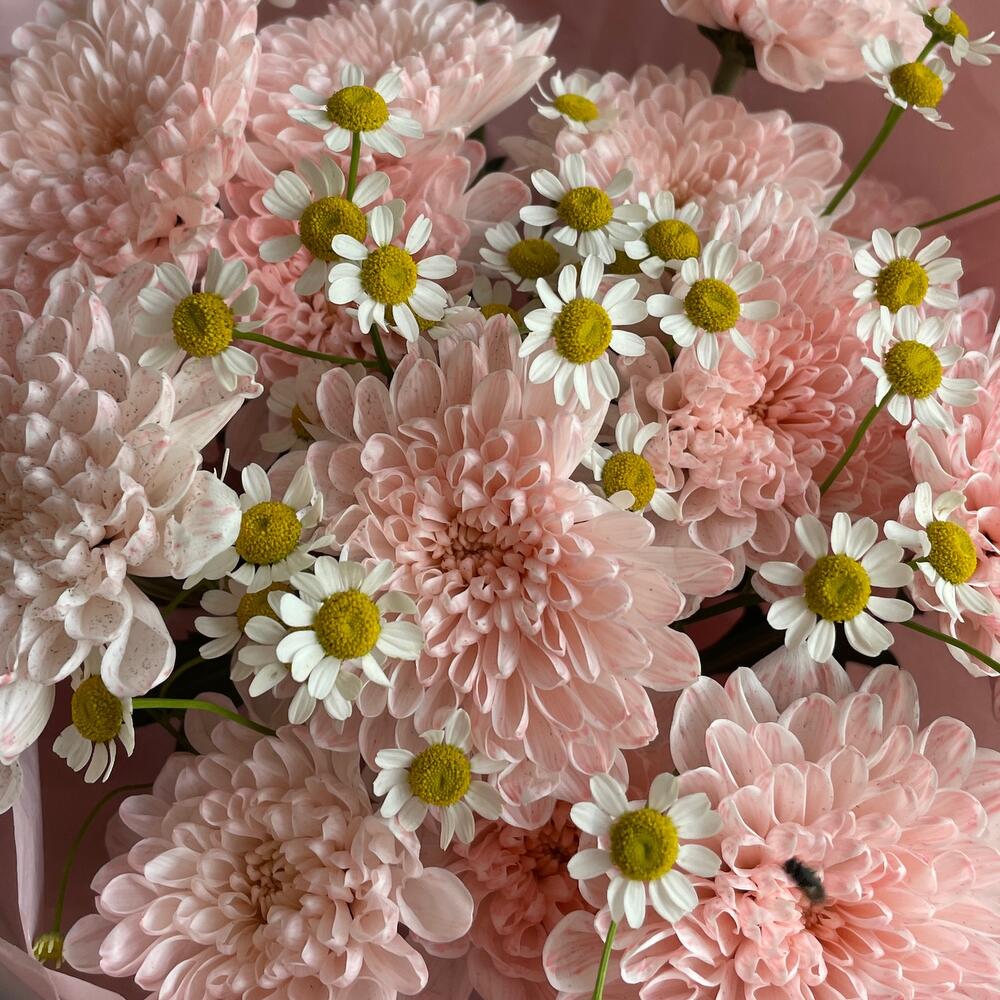 Хризантема кустовая - 3 шт. Ромашка - 1 шт. Упаковка дизайнерская - 1 шт.