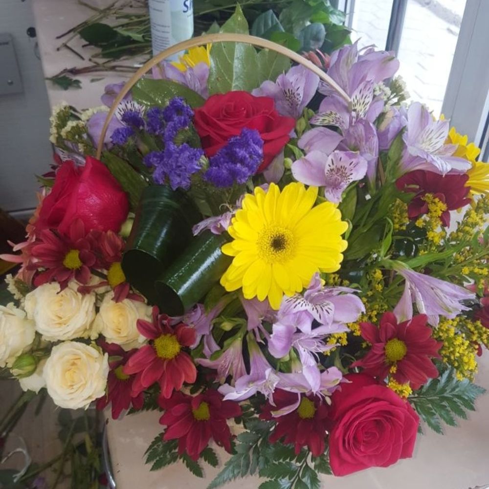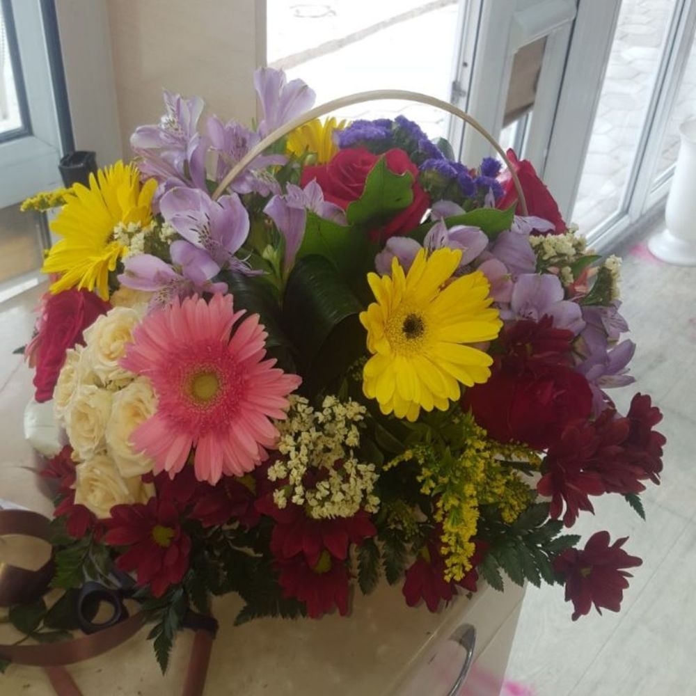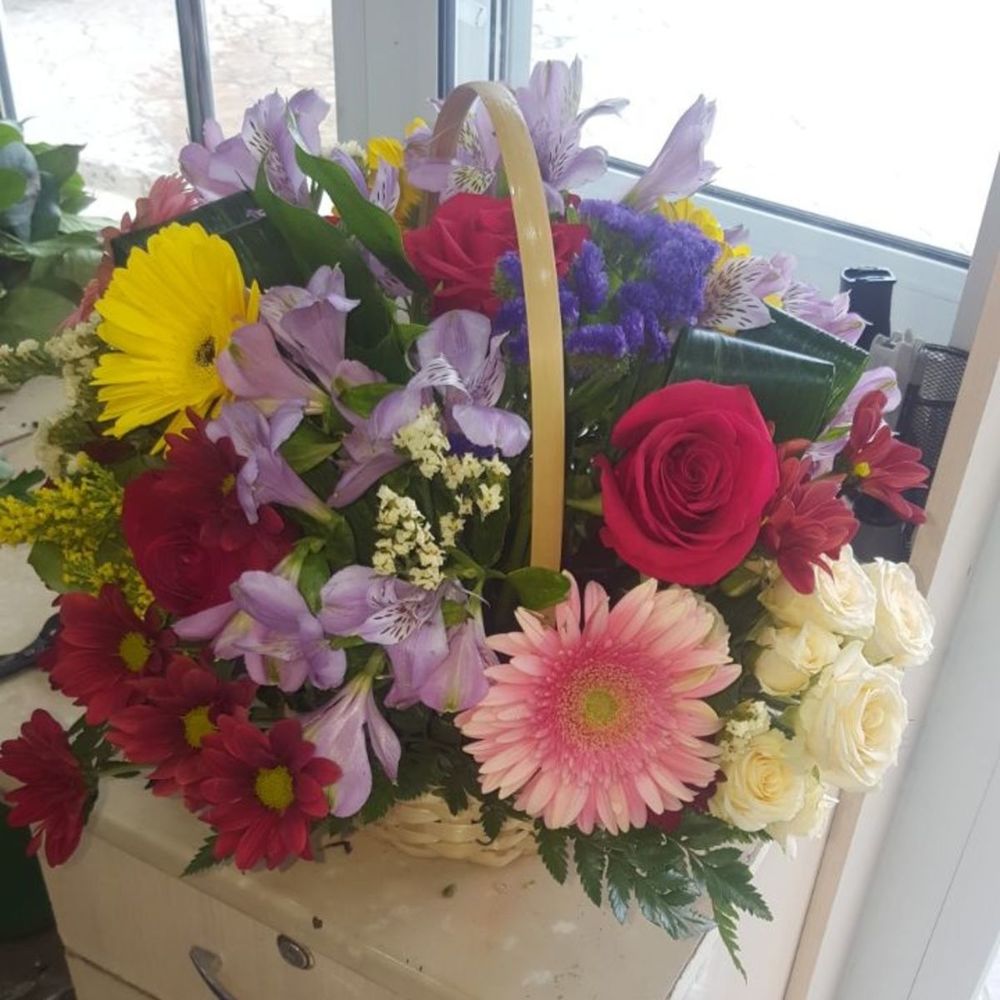 Роза - 7 шт. Хризантема - 7 шт. Альстромерия - 7 шт. Гербера - 7 шт. Зелень - 7 шт. Корзина - 1 шт. Лента - 1 шт.